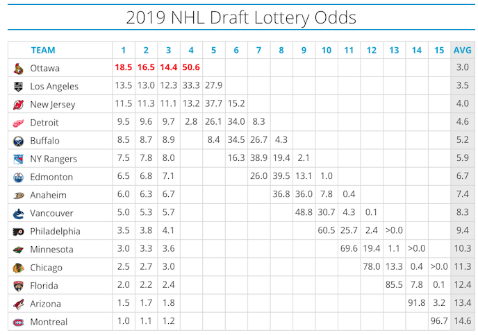 I Colorado Avalanche hanno le migliori probabilità di vedersi assegnata la prima scelta assoluta – pick ereditato da Ottawa nell’ambito del trade di Duchene – e anche nelle peggiori delle ipotesi alla franchigia di Denver non andrà una scelta al di sotto della quarta.